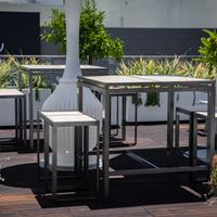 Transform a terrace or roof garden into a gallery with the addition of functional art in the form of Morrison tables. Designed by renowned modernist architect Lionel Morrison, the table frames appear to float, creating an ethereal quality balanced by the strength and texture of wood, concrete, or metal surface inserts.