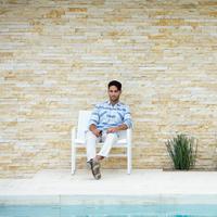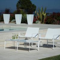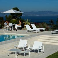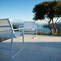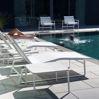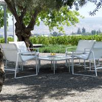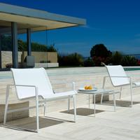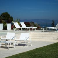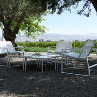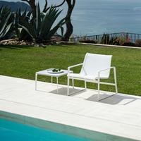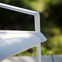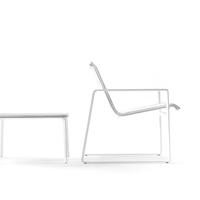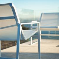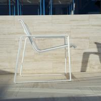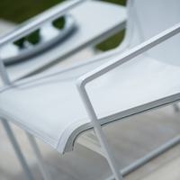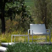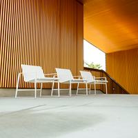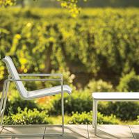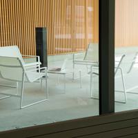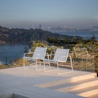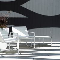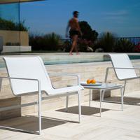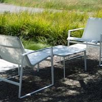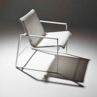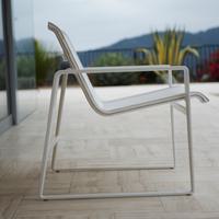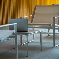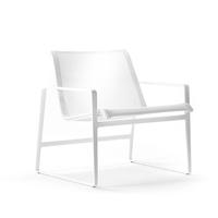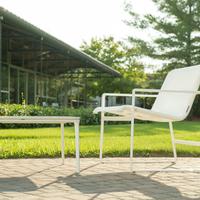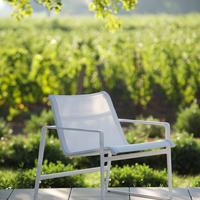 The Cochran lounge chair with arms is designed for relaxing, socializing and sitting comfortably with a phone or laptop. Wider than the typical chair, it feels generous and expansive. Its sculpted continuous loop cast frame supports an aluminum rail that stretches and holds the seating fabric and is secured to the frame with discreet connections.