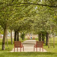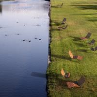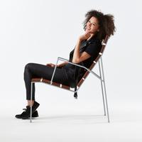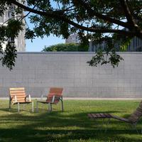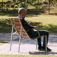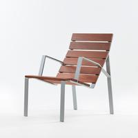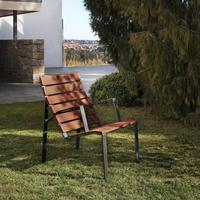 The Harpo lounge chair - designed by Miguel Milá for Urbidermis - takes the minimal form and international appeal of the Harpo bench into a more casual realm. The lounge chair has arms and a high backrest for exceptional comfort, while its robust bent and welded steel structure with slatted wood seats and backs provide performance and durability in high use public settings.