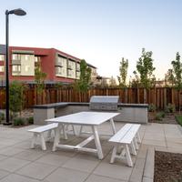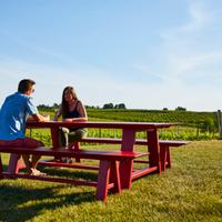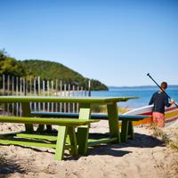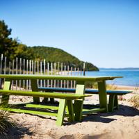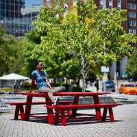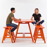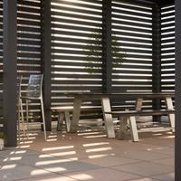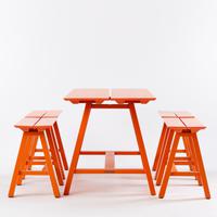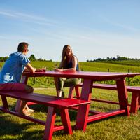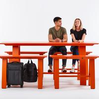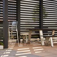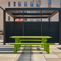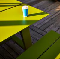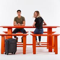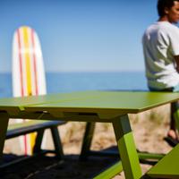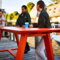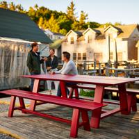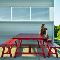 Harvest benches provide communal seating that gathers four people on each side of the Harvest table. Available in standing and dining height, the two statures create different ways for people to share outdoor experiences together—sitting, standing, leaning, eating, chatting, or simply enjoying the view.